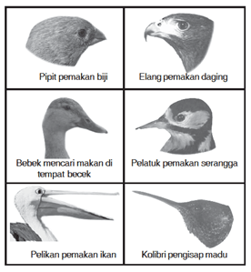 Bentuk paruh burung yang bermacam-macam tergantung jenis makanannya termasuk dalam jenis adaptasi…