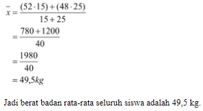 Berat badan rata-rata 15 siswa pria 52 kg, sedangkan berat badan rata-rata 25 siswa wanita 48 kg. Berat badan rata-rata seluruh siswa adalah....