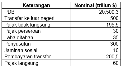 Negara ali baba memiliki data keuangan antara lain: produk domistik brutto (pdb) us$ 20,500,3 trilyun. transfer ke luar negeri us$ 500 trilyun. pajak tidak langsung us$ 195,5 trilyun, pajak perseroan us$ 30 trilyun, laba yang ditahan us$ 35, penyusutan barang modal us$ 300 trilyun. trilyun jaminan sosial us$ 10 trilyun, pembayaran transfer us$ 200,5 trilyun, pajak langsung us$ 60 trilyun.