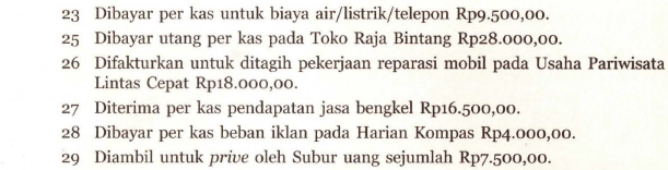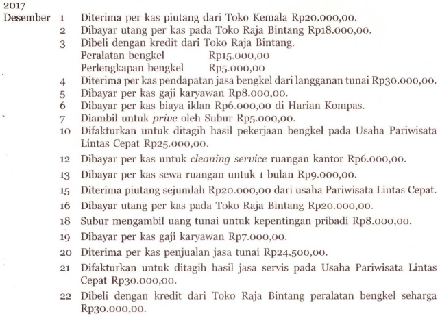 Berdasarkan data transaksi tersebut, buatlah jurnal untuk Bengkel Subur.
