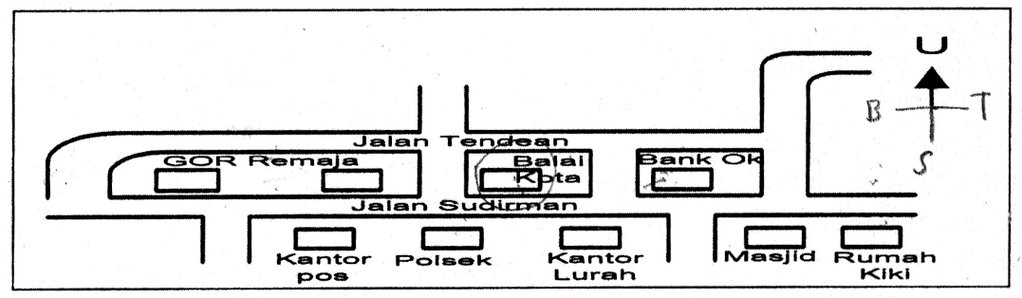 Berdasarkan denah tersebut letak Balai Kota adalah ….