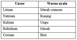 Berdasarkan tes nyala terhadap logam alkali, diperoleh warna ungu. Unsur tersebut adalah….