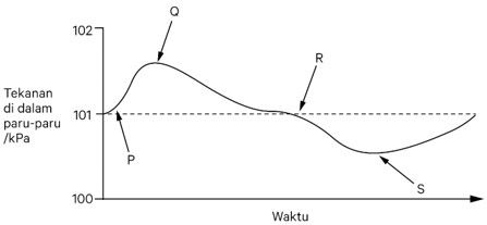 Berikut adalah grafik perubahan tekanan udara di dalam paru-paru dalam satu siklus pernapasan! Tekanan atmosfer adalah 101 kPA. Pada titik manakah otot antar tulang rusuk berkontraksi?