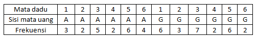 Berikut adalah tabel hasil percobaan melambungkan sebuah dadu dan sekeping mata uang logam secara bersama-sama sebanyak beberapa kali.