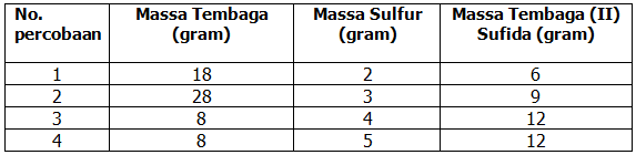 Berikut data percobaan reaksi tembaga dengan sulfur membentuk tembaga (II) sulfida: