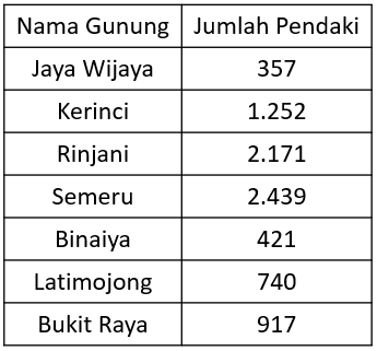 Jumlah pendaki Gunung Kerinci dan Gunung Rinjani adalah … orang.