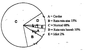 Berikut ini adalah diagram lingkaran yang menunjukkan data anak usia 8 sampai dengan 12 tahun dengan IQ di suatu daerah. Jika anak yang berusia 8 sampai 12 tahun sebanyak 320 orang, maka anak-anak dengan tingkat IQ cerdas sebanyak ....