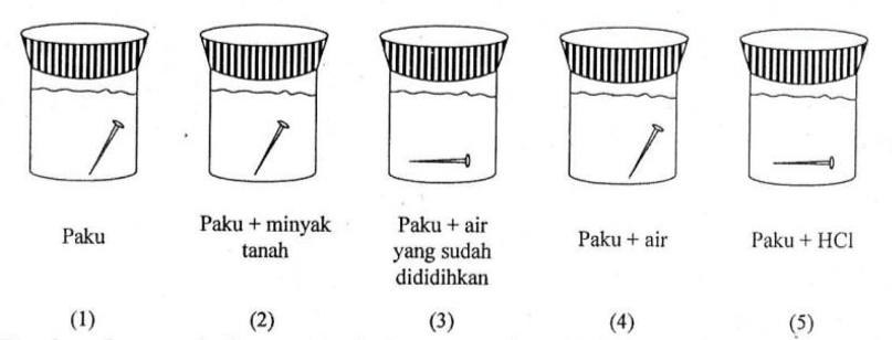 Berdasarkan percobaan tersebut, proses korosi yang paling cepat terjadi pada bejana dengan nomor...