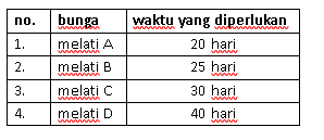 Berikut ini adalah tabel waktu yang diperlukan bunga melati untuk berbunga.