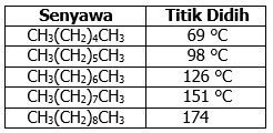 Alkana memiliki titik didih yang selalu naik seiring bertambahnya massa molekul