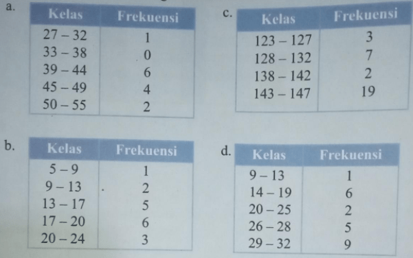 Berikut ini diberikan empat distribusi frekuensi. Setiap distribusi frekuensi yang diberikan terdapat kesalahan dalam penyusunannya. Sebutkan kesalahan masing distribusi frekuensi dan alasannya.