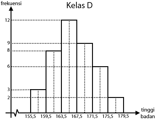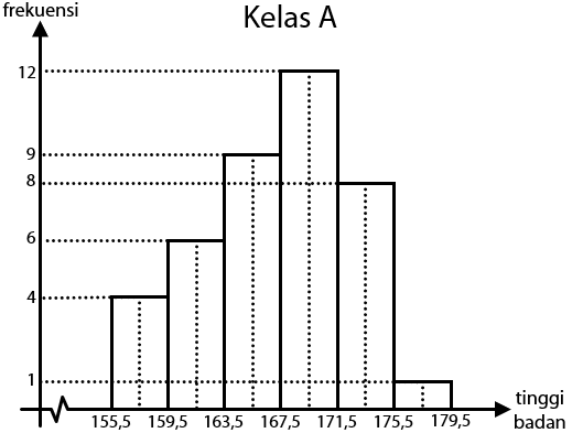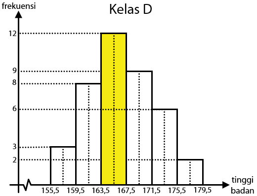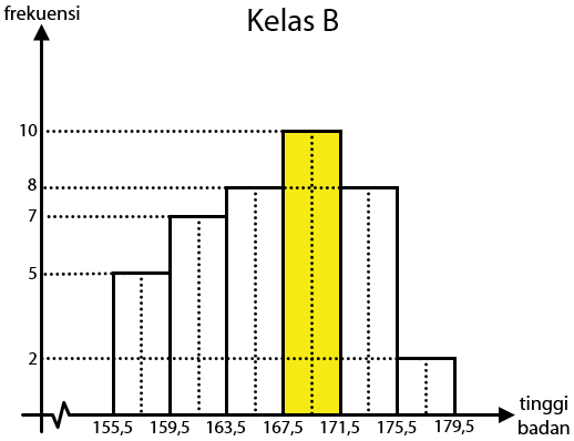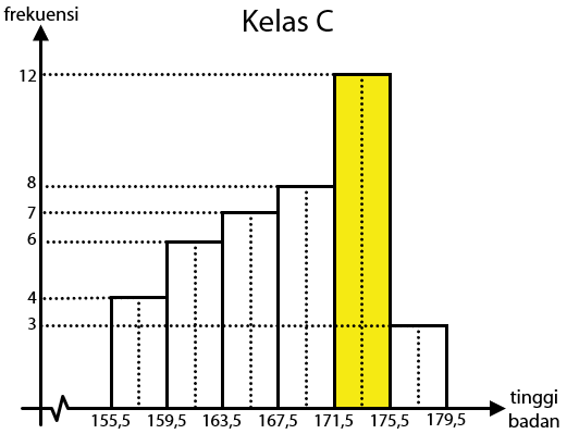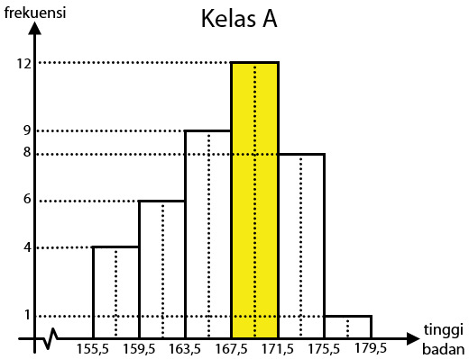 Dapat diperhatikan bahwa kelas modus ditunjukkan oleh bagian yang diwarnai karena frekuensinya paling banyak di antara yang lainnya.