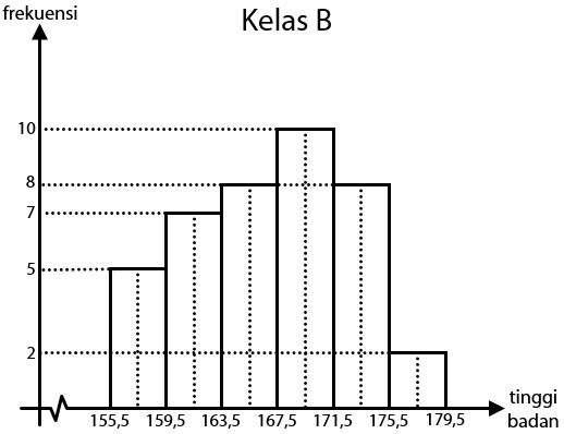 Dari hasil di atas, didapat nilai modus di kelas B lebih tinggi dibandingkan nilai modus di kelas A.