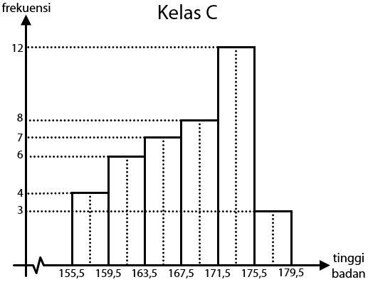 Karena kelas C memiliki modus di kelas yang lebih tinggi dibandingkan kelas lainnya, maka nilai modusnya akan lebih tinggi dibandingkan kelas lainnya.