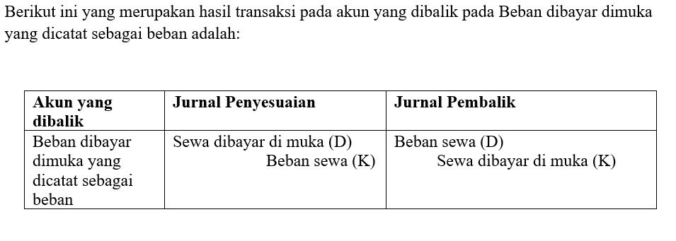 Berikut ini manakah yang merupakan hasil transaksi pada akun yang dibalik pada sewa dibayar dimuka yang dicatat sebagai beban ?