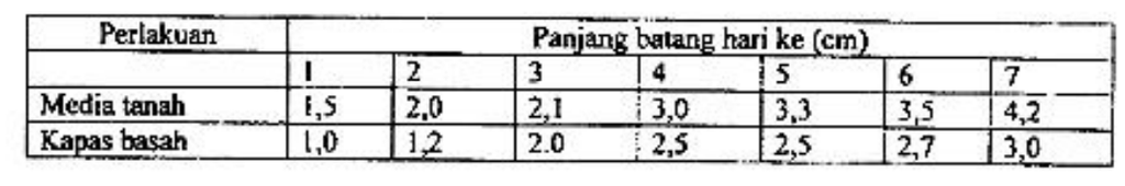 Berikut ini merupakan data hasil percobaan pengukuran kacang tanah oleh sekelompok siswa. Volume media yang digunakan sama. Pengukuran dilakukan saat muncul daun dan penyiraman dilakukan denga frekuensi sama: