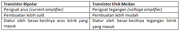 Transistor bipolar merupakan transistor yang berperan sebagai penguat arus, sedangkan transistor efek medan sebagai penguat tegangan