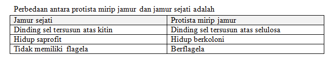 jamur hidup secara berkoloni, sedangkan protista mirip jamur hidupnya saprofit