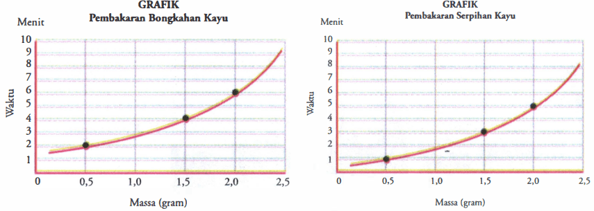 Berikut penyajian data hasil percobaan perbedaan pembakaran bongkahan kayu dan serpihan kayu dalam bentuk grafik!