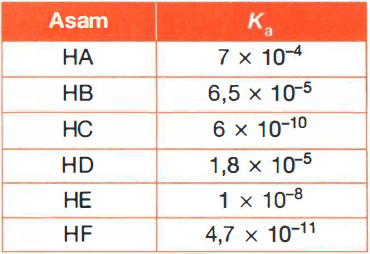 Berdasarkan tabel di atas, dapat ditarik kesimpulan bahwa urutan kekuatan asam-asam tersebut adalah ....