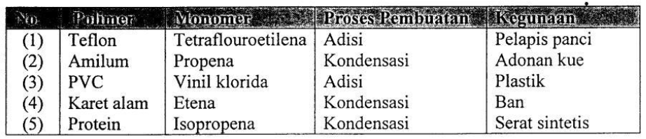 Berikut tabel yang berisi data polimer, monomer, proses pembentukan, dan kegunaannya: