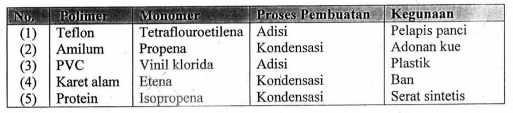 Berikut tabel yang berisi data polimer, monomer, proses pembentukan, dan kegunaannya: