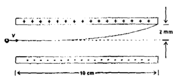 Berkas elektron berkecepatan memasuki celah antara dua pelat kapasitor, sehingga berkas menyimpang sejauh 2 mm ketika keluar dari pelat kapasitor. Besar kuat medan magnet dan arah yang harus diberikan adalah....
