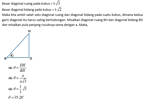 Besar sudut yang terbentuk antara diagonal ruang dan diagonal bidang dalam sebuah kubus ABCD.EFGH adalah….