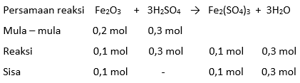 Besi(III) oksida (=160) bereaksi dengan asam sulfat ( = 98) pada suhu tertentu membentuk besi(III) sulfat menurut reaksi berikut.