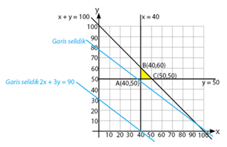 Biaya produksi satu buah payung jenis A adalah Rp20.000,00 per buah, sedangkan biaya satu buah produksi payung jenis B adalah Rp30.000,00. Seorang pengusaha akan membuat payung A dengan jumlah tidak kurang dari 40 buah. Sedangkan banyaknya payung jenis B yang akan diproduksi minimal adalah dari 50 buah. Jumlah maksimal produksi kedua payung tersebut adalah 100 buah. Biaya minimum yang dikeluarkan untuk melakukan produksi kedua payung sesuai ketentuan tersebut adalah…
