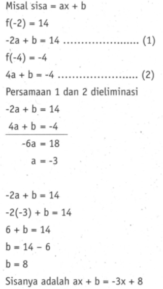 Bila f(x) dibagi oleh (x + 2) mempunyai sisa 14, dan dibagi oleh (x - 4) mempunyai sisa -4, maka bila f(x) dibagi mempunyai sisa....