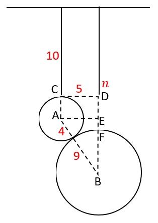 Diameter Bola A dan Bola B berturut-turut adalah 8 dan 18. Jika jarak ujung tali l dan n pada kawat adalah 5 dan panjang tali l adalah 10, berapakah panjang minimum tali n agar kedua tali bisa sejajar dan bola tidak saling menekan?