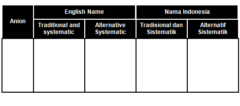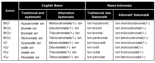 Bromin dan iodin membentuk anion-anion okso seperti anion-anion okso dari klorin, Tuliskan rumus dan namanya pada tabel di bawah ini.