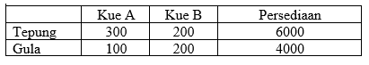 Bu Mira akan membuat 2 jenis kue. Bahan untuk membuat kue sudah disiapkan, yaitu 6 kg tepung dan 4 kg telur. Kue jenis A memerlukan 300 gram tepung dan 100 gram gula, sedangkan kue jenis B memerlukan 200 gram tepung dan 200 gram gula. Banyak kue jenis A dan kue jenis B yang dapat dibuat dengan bahan yang tersedia adalah….