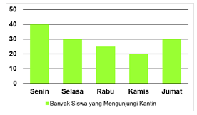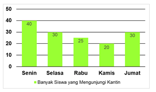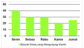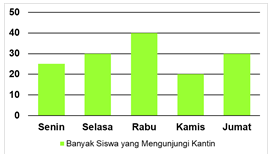 Bu Yeni sebagai pembina kantin sekolah, mencatat banyaknya siswa yang mengunjungi kantin untuk membeli makanan dan minuman pada jam istirahat. Setiap hari Senin dan Selasa sebanyak 40 siswa dan 30 siswa, hari Rabu 25 siswa, Kamis dan Jumat masing-masing 20 siswa dan 30 siswa. Bu Yeni diminta kepala sekolah untuk membuat catatan tersebut ke dalam bentuk diagram batang.