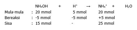 Campuran yang berasal dari 100 mL larutan NH4OH 0,2 M (Kb = 10-5) dengan 100 mL larutan NH4Cl 0,2 M ditambahkan 10 mL larutan HCl 0,5 M. pH larutan yang terjadi adalah ...