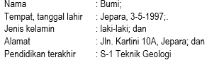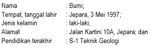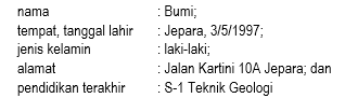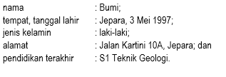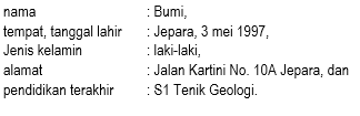 Identitas merupakan keterangan berupa nama, tempat dan tanggal lahir, alamat, pendidikan terakhir, serta dapat ditambah lagi sesuai dengan kebutuhan. Dalam menuliskan keterangan tersebut, awalan kata atau format identitas (nama, tempat dan tanggal lahir, alamat, dan sebagainya) harus ditulis dengan menggunakan huruf kecil, bukan huruf kapital. Selanjutnya, gunakanlah tanda titik koma (;) untuk memisahkan perincian satu dengan lainnya. Terakhir, gunakanlah tanda titik (.) di akhir perincian.