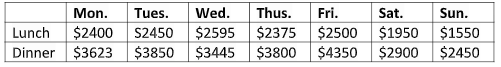 The sales of dinner are ____ compared to the sales of lunch for the six days period.