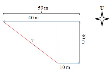Christiano Ronaldo menggiring bola lurus 10 meter ke timur, kemudian berbelok ke utara sejauh 30 meter yang selanjutnya berbelok ke barat sejauh 50 meter. Perpindahan yang dilakukan Christiano Ronaldo tersebut dari posisi awal sejauh ....