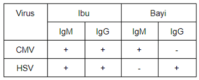CMV dan HSV adalah dua virus yang menyerang ibu hamil dan dapat juga menginfeksi janin yang sedang dikandungnya sehingga menimbulkan kecacatan. Uji serologi IgG dan IgM dapat dilakukan untuk menguji apakah bayi yang lahir terinfeksi virus dan apakah virus ditransfer melalui plasenta selama bayi di dalam kandungan ibunya. Berikut adalah data hasil uji serologi dari ibu pada trimester pertama dan bayi setelah satu bulan dilahirkan.