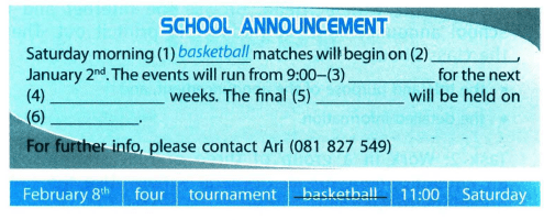 Kata yang sesuai untuk mengisi bagian rumpang nomor 1 adalah basketball atau bola basket. Pada bagian rumpang nomor 2, kata Saturday atau sabtu sesuai dengan konteks kalimat. Sedangkan nomor 3, bisa dilengkapi dengan keterangan waktu yaitu 11.00. Nomor 4 dapat diisi dengan kata four atau empat. Kalimat ke 5 dapat diisi dengan kata tournament atau pertandingan, dan kalimat terakhir dengan kata kata February 8th atau 8 Februari.