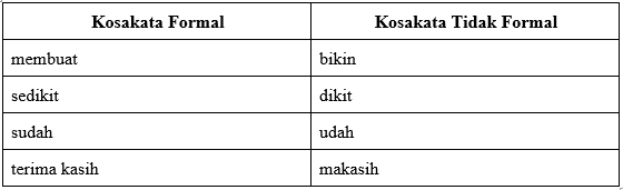 Contoh kosakata tidak formal yang biasa digunakan dalam percakapan lisan adalah ….