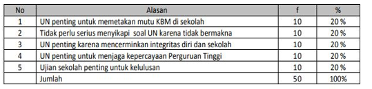 Contoh table data pendapat siswa SMA tentang UN yang tidak lagi menjadi penentu kelulusan: