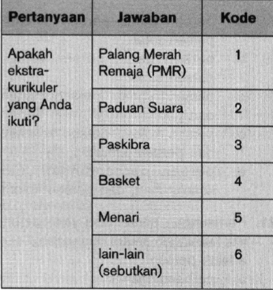 Dalam mengolah data penelitian kuantitatif, data yang diolah adalah jawaban dari responden yang sebelumnya telah kita buat pertanyaan. Pertanyaan-pertanyaan penelitian terbagi dalam tiga ketegori, yaitu pertanyaan tertutup, terbuka dan semi terbuka. Salah satu pertanyaan yaitu pertanyaan semi terbuka merupakan pertanyaan yang sebagian jawabannya sudah ditentukan, tetapi masih ada kemungkinan bagi responden untuk memberikan jawaban lain atau adanya alternatif jawaban. Jika terdapat jawaban yang berbeda maka diberi kategori lain-lain. Contoh angket dengan pertanyaan semi terbuka ada pada tabel pada soal.