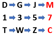 Huruf D akan menjadi huruf G ketika digeser sebanyak tiga huruf berikutnya. Begitu pula dengan huruf G menjadi huruf J.