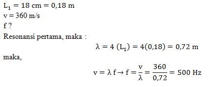 Dalam kolom udara sepanjang 18 cm, terdengar resonansi bunyi untuk pertama kalinya. Jika cepat rambat bunyi dalam kolom tersebut sebesar 360 m/s, maka besarnya frekuensi garpu tala yang digunakan adalah .…