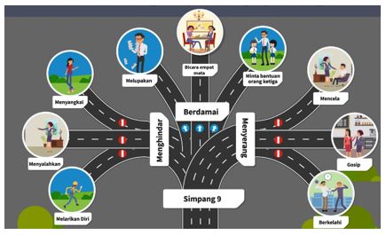 Dalam menghadapi konflik, sering kali kita dihadapkan pada beberapa pilihan cara menyelesaikan konflik. Akan tetapi, ada beberapa dari pilihan tersebut justru tidak menyelesaikan konflik yang sedang dihadapi. Oleh karena itu, contoh dari jalan damai berdasarkan simpang 9 yang tepat dilakukan di bawah ini adalah ….