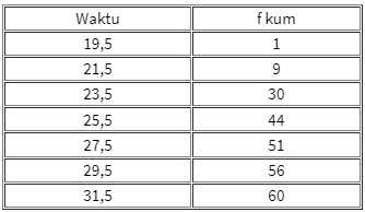Dalam rangka hari jadi suatu SMA, dimeriahkan dengan Iomba lari dan waktu yang ditempuh oleh 60 peserta sampai garis finish ditunjukkan pada tabel berikut.
