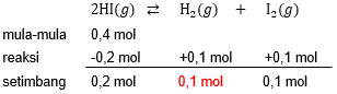 Bila mula-mula terdapat 0,4 mol HI, dan diperoleh 0,1 mol gas hidrogen pada saat setimbang, maka besarnya derajat disosiasi HI adalah ....