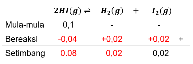 Jika dalam kesetimbangan terbentuk 0,02 mol gas . Maka tetapan kesetimbangannya (Kc) adalah....